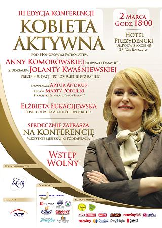 Już po raz trzeci Elżbieta Łukacijewska, Poseł do Parlamentu Europejskiego organizuje konferencję "Kobieta Aktywna", która odbędzie się 2 marca 2012 r. (piątek) o godzinie 18:00 w Hotelu Prezydenckim w Rzeszowie. Pani Poseł postanowiła w tym roku zaprezentować dwa panele zatytułowane Siła Młodości oraz Siła Doświadczenia. W trakcie dyskusji mowa będzie o tym, co to znaczy być kobietą silną, jak wykorzystywać tę wrodzoną siłę w różnych sferach życia: w partnerstwie, macierzyństwie, pracy zawodowej, a także o tym, jak czerpać mądrość z doświadczeń na każdym etapie życia.
