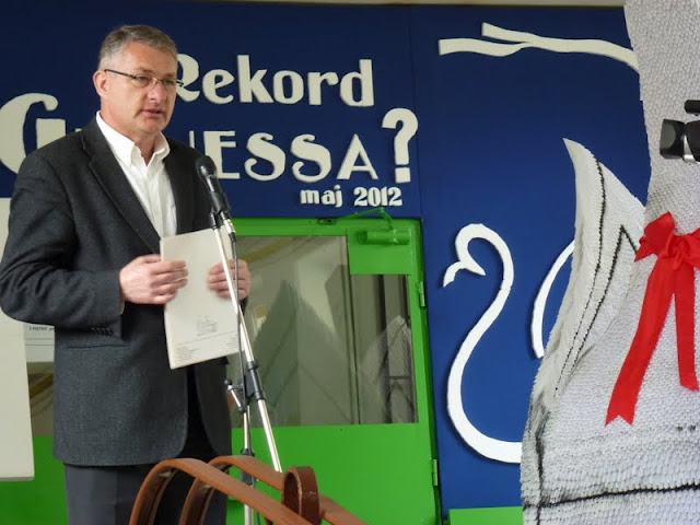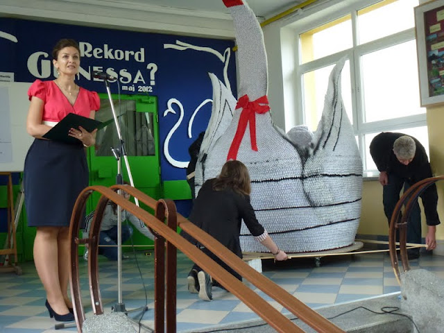 Przez wiele miesięcy uczniowie Gimnazjum, pod kierunkiem Pani Ewy Prajzner koordynatora akcji bicia rekordu świata, tworzyli przepięknego papierowego łabędzia o wysokości ponad 2 metrów, a ważącego około 100 kg. Owoc tego wysiłku to powód do ogromnej satysfakcji wszystkich osób, które tworzyły tego przestrzennego ptaka. Gratulowałem pomysłu, a nade wszystko umiejętności współdziałania w grupie, odpowiedzialności i cierpliwości. Podkreśliłem, że w w życiu łatwiej jest stawiać sobie cele niźli je skutecznie i z powodzeniem realizować. Społeczność Gimnazjum nr 3 zaangażowana w ten niecodzienny projekt pokazała, że potrafi osiągać cele.